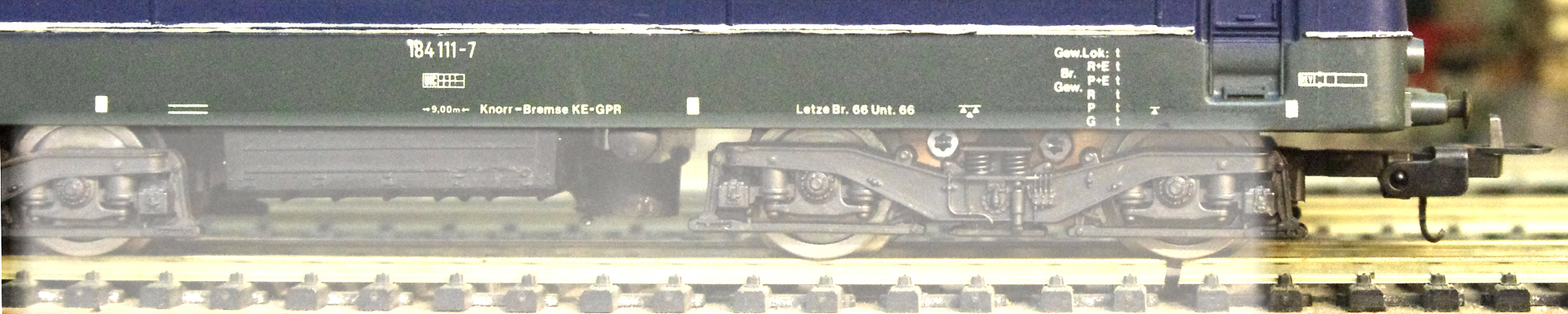 Die zusammengelöteten neuen Stromabnehmer wurden zwischen Drehgestellkörper und die von den Achsen isolierten Räder geschraubt. Das gab der 184 eindeutig bessere Fahreigenschaften.